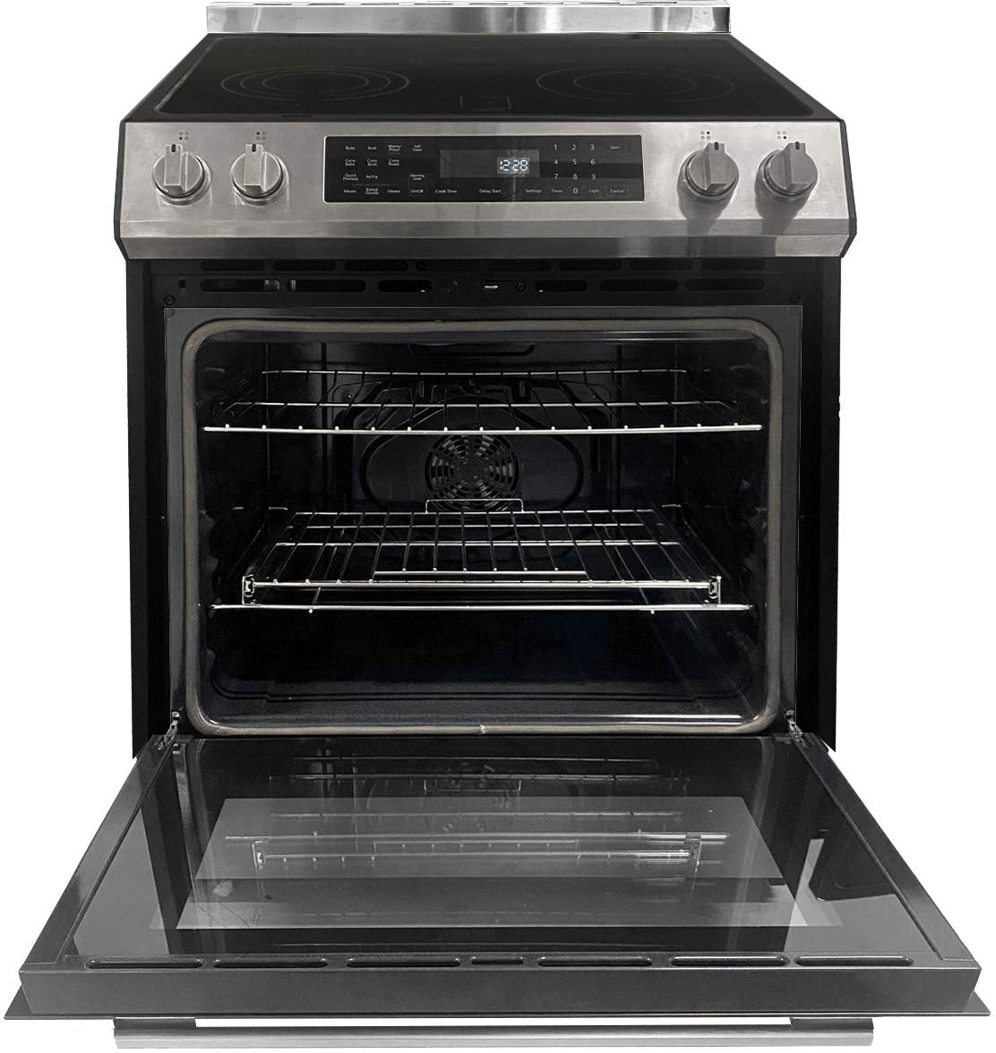 Self clean convection oven with AirFry feature & basket. High end commercial grade blue interior, 1 fixed & 1 telescopic rail extension rack, digital control panel with clock/timer, convenient storage drawer, stainless steel backguard and handle.Read More