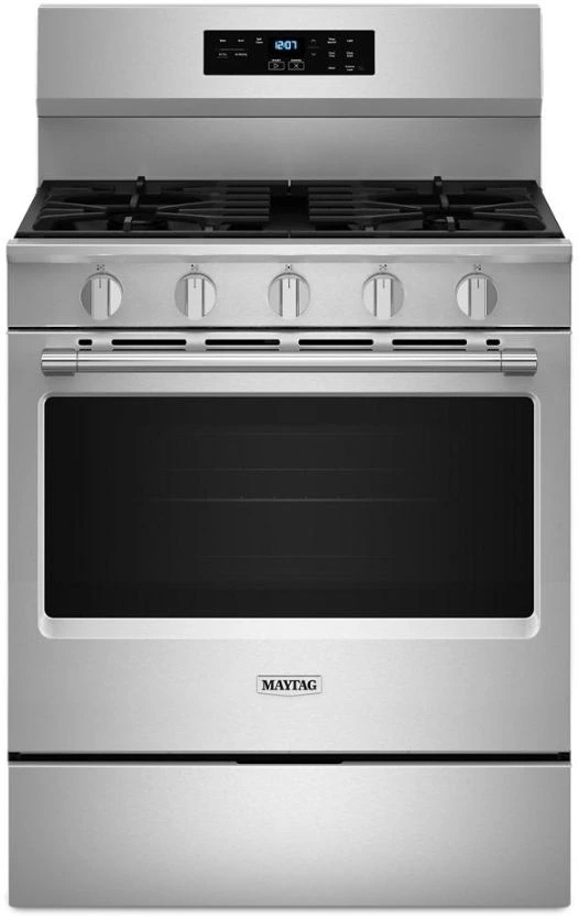 Maytag® 30" Fingerprint Resistant Stainless Steel Freestanding Gas Range features No Preheat Air Fry, Power™ Burner, High Temp Self Clean, Precision Cooking™ System, Edge-to-Edge Dishwasher-Safe Cast Iron Grates, Simmer Burner, and Air Powered Convection.Read More