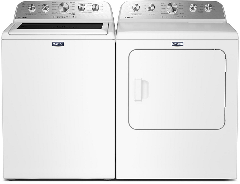 Maytag® White Top Load Laundry Pair with a 5.5 cu. ft. capacity top load washer and a 7 cu. ft. capacity front load gas dryer.Read More
